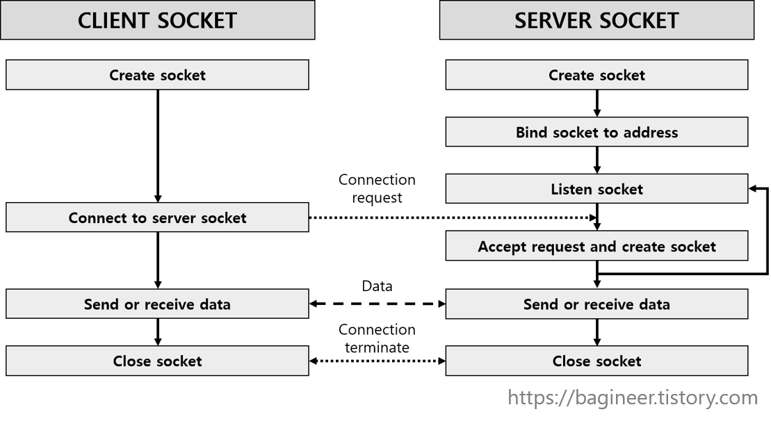 소켓 통신의 flowchart는 위의 그림과 같다.