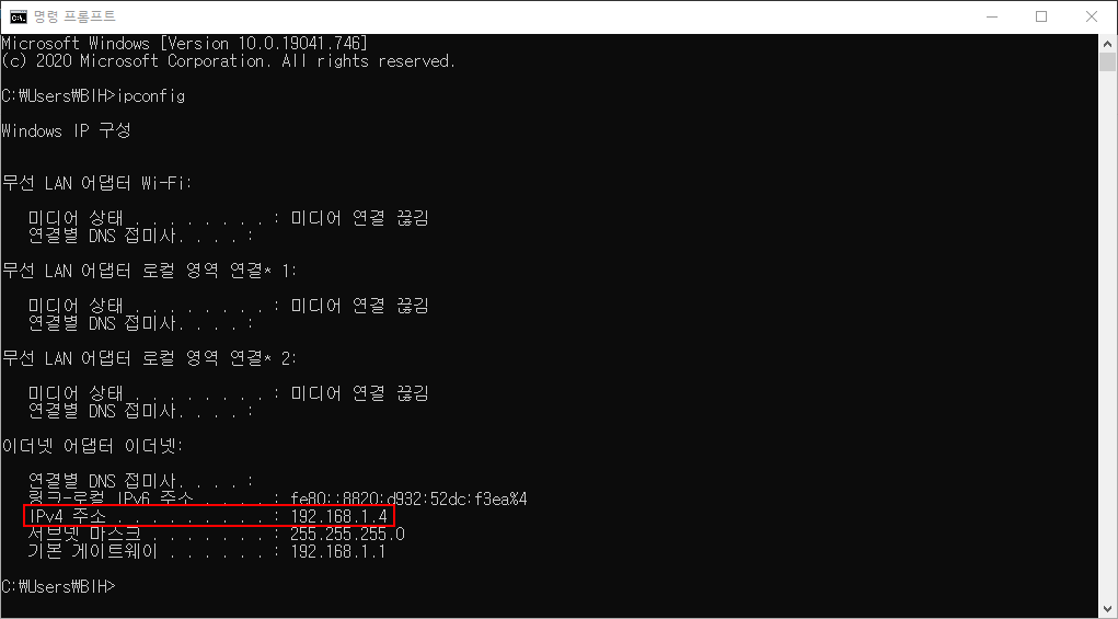 내 pc의 ip주소는 윈도우 command 창에서 확인할 수 있다.