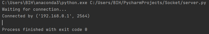 마지막으로 클라이언트의 접속 요청을 처리한다. 클라이언트가 접속을 시도하면 서버에서는 accept 메소드로 클라이언트 소켓과 연결한다. 클라이언트가 서버에 접속하면 서버에서는 클라이언트가 연결되었다는 메시지와 함께 클라이언트의 주소를 출력한다.